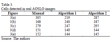 Fig. 4 shows the results obtained on real images. In the caption, we describe the color code used to identify the outcome of the algorithm that was utilized in each case. Table 3 shows the number of cells that were manually detected by the authors and those detected by each algorithm.