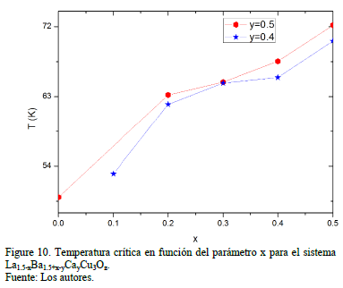 En la Fig. 10 se representa la Tc Vs x, se evidencia que al variar los parámetros x e y del sistema La1.5-xBa1.5+x-yCayCu3Oz se presenta un cambio en la temperatura crítica; comparando [1,8,10], con los resultados obtenidos se ve claramente como la Tc crece con el incremento de x e y.