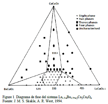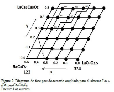 El CLBCO fue descubierto en 1988 por W. T. Fu [3] y D. M. De Leeuw [5] a través de estudios de sustitución y dopaje de los compuestos TR-123. Ellos observaron que el LaBaCaCu3Ox posee una estructura tetragonal isomorfica, tipo YBaCu3O7-d, con el Ca y el La localizados en los sitios de Y y de Ba, presentando una temperatura crítica de aproximadamente 80 K. La fase tetragonal representa simetría de grupo espacial P4/mmm. Este compuesto es denominado comúnmente de TR: 1113 o CLBCO y es un prototipo de TR: Ba2Cu3O7, donde 40 % del sitio de TR es ocupado por el ion de Ca y el 60 % restante es ocupado por el ion de La. Uno de los sitios de Bario es ocupado por una distribución de iones de Ca y La. Esta distribución hace que los sitios de oxígeno O(4) y O(5), en las cadenas, estén aleatoriamente ocupados, formando así una estructura tetragonal independientemente del contenido de oxígeno [6]. Al contrario de la estructura de los elementos TR-123 el CLBCO presenta una estructura siempre tetragonal independiente del contenido de oxígeno con a = b = 3.8655 Å y c = 11.6354 Å, el contenido de oxígeno en ese compuesto es de aproximadamente 7.0. West y colaboradores propusieron el diagrama de fase para el sistema La1.5-xBa1.5+x-yCayCu3Oz en condiciones normales de presión a una temperatura de 950 °C con 0<x<0.5 y 0<y<0.5 [7]. West observó que la estructura del sistema La1.5-xBa1.5+x-yCayCu3Oz puede coexistir con pequeñas cantidades de BaCuO2, Ca2CuO3 y CuO y que para ser obtenida una estructura monofásica es preciso usar x≥0.5 y 0.2<y<0.5, obteniendo una temperatura crítica de 77 K. con parametros x=0.5 y y=0.5. Los resultados se esquematizan en la Fig. 1, ampliando la escala de la zona de fase Fig. 2 donde se puede observar los sistemas de estudio.