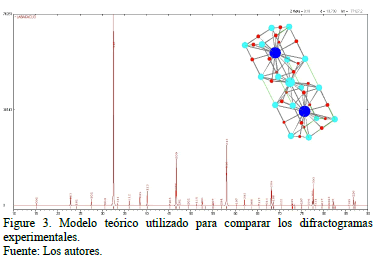 Los difractogramas experimentales fueron comparados con el modelo estructural propuesto por West [2]. A partir de este modelo se generó la celda unitaria del CLBCO, la cual fue comparada con cada difractograma y finalmente se concluyó, al igual que West, que el modelo consistente correspondía al de los datos consignados en la Tabla 1. En esta tabla se consigna el grupo espacial, que corresponde a la estructura tetragonal, los parámetros de red, la posición atómica de cada uno de los iones en la celda y su factor de ocupación. A partir de estos datos fue posible modelar la estructura ideal en el programa PowderCell, denominado modelo teórico, para efectos del refinamiento de los datos de difracción. La estructura ideal del sistema La1.5+xBa1.5+x-yCayCu3Oz, así como su difractograma más probable Fig. 3. Una primera inspeccion a los difractogramas experimentales permite afirmar que las muestras producidas sí corresponden a una estructura con las características esperadas. En la Fig. 4 se presentan todos los difractogramas obtenidos experimentalmente, y se diferencia cada muestra con un color diferente.