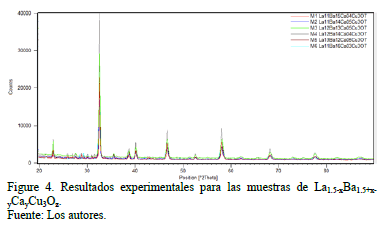 El sistema La1.5+xBa1.5+x-yCayCu3Oz fue analizado a partir de bases de datos cristalográficas tales como la ICSD, comparándolo con el modelo propuesto por West [1] y otros [5], el modelo teórico utilizado para comparar las muestras superconductoras se encuentra en la Tabla 1. El resultado de los difractogramas obtenidos para las muestras de La1.5+xBa1.5+x-yCayCu3Oz, en la Fig. 4, se observa que es muy consistente con lo esperado, pues evidencia la estructura tetragonal predicha por West [1].