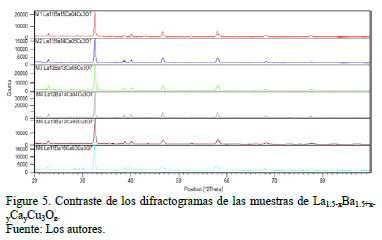 Una comparación más estricta de todas las muestras se presenta en la Fig. 5, en ella se representa en diferente color las muestras de acuerdo con la simbología manejada. El análisis de esta imagen permite concluir que las muestras son de fase pura pues presentan las mismas características de otras muestras del mismo sistema La1.5-xBa1.5+x-yCayCu3Oz.