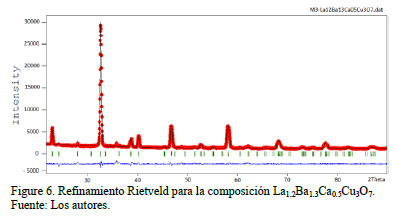 En la Fig. 6 se muestra el resultado del refinamiento Rietveld para la composición La1.2Ba1.3Ca0.5Cu3O7, donde la línea roja corresponde al patrón experimental, la línea negra el patrón teórico ajustado en el programa FullProf, las líneas verdes representan las reflexiones de Bragg de la fase utilizada y la línea azul la diferencia entre el patrón ajustado y el patrón experimental.