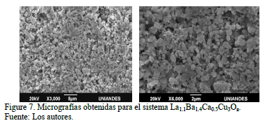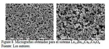 De los análisis de las micrografías, y a partir de los difractogramas de las mismas, se puede establecer que el sistema La1.5-xBa1.5+x-yCayCu3Oz, presenta una fase superconductora pura; lo cual comprueba las afirmaciones realizadas anteriormente. En las Figs. 7 y 8 se puede ver una representación típica de las características morfológicas de este tipo de muestras. De estas figuras se puede establecer que la fase superconductora se conformó de una manera similar en cada muestra [8,9]. Igualmente se corrobora que no hay presencia de impurezas y que estas muestras cumplen con la estequiometria esperada. La técnica EDX permitió establecer el porcentaje de los elementos químicos en cada muestra, estos resultados pueden ser vistos en la Tabla 2.