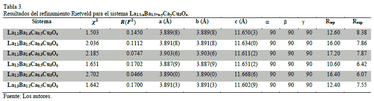 En la Tabla 3 se muestran los resultados obtenidos para los parámetros de red y los parámetros X2 y R(F2) del refinamiento Rietveld para el sistema La1.5-xBa1.5+x-yCayCu3Oz. Se observa que la variación de La, Ba y Ca en el sistema no afecta de forma notoria los parámetros de red, lo cual es un indicio de la estabilidad estructural del sistema y de su alta anisotropía planar a<