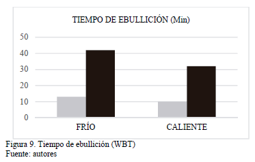 Puede observarse en los gráficos de las Figs. 8 y 9 el importante incremento en la eficiencia energética de la cocción, así como una reducción de tiempo y consumo de biomasa para alcanzar la ebullición del agua