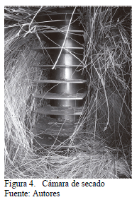 La Fig. 4 muestra la estructura de la cámara de secado. Uno de los principales factores que determinan la capacidad calorífica de una biomasa es su contenido de humedad. En el caso de quemarse madera húmeda, es necesaria cierta cantidad de calor para evaporar el agua contenida en ella, con lo que se ve afectada la combustión. En lugares con climas lluviosos se dificulta el acceso a biomasa seca, por lo que los procesos de combustión son generalmente poco eficientes.
