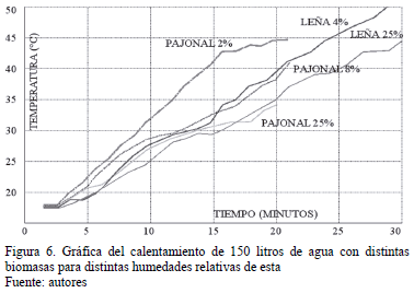 En cuanto al consumo de biomasa se observa un menor consumo relativo de esta en el caso de utilizar leña. Se requirieron 2,09 kg de leña con un 4% de humedad relativa, frente a 2,4 kg de pajonal con una humedad relativa del 8%, para el calentamiento de 150 litros de agua entre 18 y 40ºC y una temperatura ambiente de 20ºC. Pese a dicha diferencia es necesario tener en cuenta que el pajonal es un recurso natural abundante en el páramo andino. El comportamiento de diferentes biomasas se muestra en la Fig. 7.