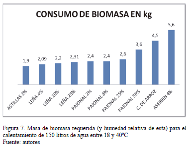 En el gráfico de la Fig. 6 puede observarse el tiempo requerido para el calentamiento del agua mediante el uso de las distintas biomasas.