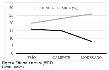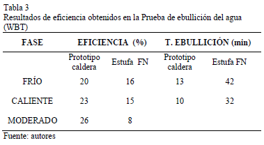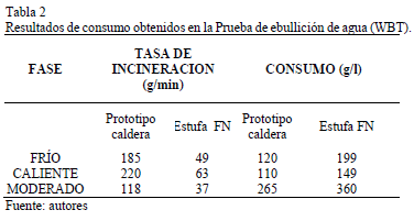 La WBT simula, por lo tanto, el proceso de cocción y está conformada por tres ensayos: WBT (frío), en el cual la estufa se enciende al iniciar el día; WBT (caliente), en la que la estufa se encuentra precalentada, y WBT (a fuego lento), en el cual se trata de simular un proceso de cocción tradicional. Los parámetros evaluados por la WBT son el consumo específico de combustible (SCWBT, kg biomasa / litro de agua), que se muestra en la Tabla 2, y la eficiencia térmica (h, %), mostrada en la Tabla 3. La eficiencia térmica es una relación entre la tarea de ebullición y evaporación del agua frente a la energía suministrada por la combustión de la biomasa. [12]