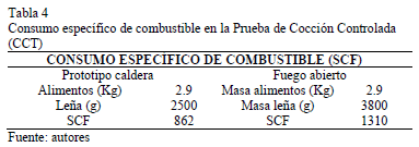 En la Tabla 4 se compara el consumo especifico de combustible entre la Caldera cocina y el fogón tradicional. Puede observarse que se obtienen reducciones del consumo de leña del 34%. La caldera ha sido probada en los laboratorios de Energía Mecánica de la Universidad de Fuerzas Armadas en Salgolquí (Ecuador) a 2539 m.s.n.m. y con una presión atmosférica de 560 mm Hg. (0.74 atm) Pese a que la Prueba de Ebullición de Agua (WBT) y la Prueba de Cocinado Controlado (CCT) no hacen referencia a la presión atmosférica a la que deben efectuarse, dicha condición afecta evidentemente a la temperatura de ebullición del agua. A la presión atmosférica de Sangolquí el agua hierve en torno a los 92ºC y no a los 100ºC habituales a nivel del mar. Es por ello que los valores de los resultados comparados de las pruebas deben tener en cuenta dicha circunstancia. La diferencia de entalpias de saturación, para las presiones atmosféricas comparadas es de 34 kJ/kg de agua. Por ello para cualquier biomasa que se consuma en la caldera a nivel del mar debe aumentarse en aproximadamente un 8% la masa total del combustible.