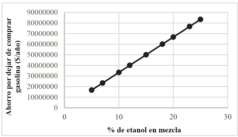 En la Fig. 8 aparecen representados los parámetros: ahorro por dejar de comprar gasolina ($/año) vs proporción de etanol en la mezcla. Se puede apreciar cómo por cada porcentaje de incremento de la cantidad de etanol en la mezcla se pueden ahorrar 3 334 800 $/año por el concepto de no comprar gasolina.