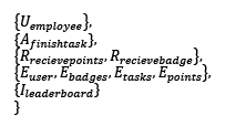 Entities: Euser - all system employee, EBadges - types of badges, ETasks - the tasks which can be completed by employees, EPoints - points gained by the users.