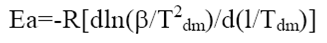 Los cálculos de la energía de activación fueron calculados usando el modelo de Kissinger. Para este estudio se utilizó la temperatura en que estos procesos iniciaron, la cual fue determinada por las curvas de TGA y DSC de los materiales calentados a diferentes velocidades. El cálculo de la Ea por el modelo de Kissinger, fue determinada a través de la tangente de la gráfica de Ln(β/T2dm) Vs 1/Tdm [22].