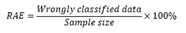 RAEApparent error rateWrongly classified dataNumber of the sample data that are outside the range stipulated by the discriminant breakpointSample sizeTotal number of data (pixels)The apparent error rate was calculated for both samples of mining and non-mining areas. Afterwards, the weighted average value that characterized the weighted rate of the apparent error was obtained.