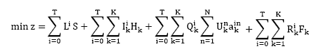 El modelo que se presenta a continuación, busca minimizar el costo total representado por los costos de pedido, costo de almacenamiento, costos del producto y los costos incurridos por subestimar la demanda. El modelo admite descuentos por cantidad. A continuación se definen cada una de las variables usadas en el modelo y se hace una representación de la función objetivo.
