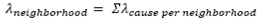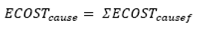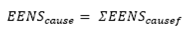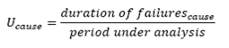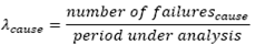 (26)Where λcause is the average failure rate associated with the cause of failure, number of failurescause is the number of valid failure records that the given cause of failure presents, duration of failurescause is the sum of durations of valid failure records that the given cause of failure presents, period under analysis is the time period measured in years for which the reliability diagnosis is performed, Ucause is the annual outage duration associated with the cause of failure, EENScausef is the expected energy not supplied index associated with the cause of failure, which corresponds to failure record f, ECOSTcausef is the expected interruption cost index associated with the cause of failure, which corresponds to failure record f, j is the element in which the failure occurred (j can be any of these values: A, PL, PR, PT or PS), EENSj is the expected energy not supplied index associated with element j, EENSjf is the expected energy not supplied index associated with element j, which corresponds to failure record f, ECOSTj is the expected interruption cost index associated with element j, ECOSTjf is the expected interruption cost index associated with element j, which corresponds to failure record f, λcircuit is the average failure rate of the distribution circuit under study, Ucircuit is the annual outage duration of the distribution circuit under study, and λneighborhood is the average failure rate in the given neighborhood.