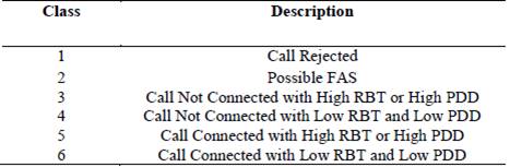 Two SVM approaches were validated using 10-fold Cross-validation [28]. First, a six class approach was validated for the classes presented in Table 1. Second, a two class approach was validated that confronted Class 2 (Possible FAS) against Class 5 (Call Connected with High PDD or High RBT) and Class 2 (Possible FAS) against Class 6 (Call Connected with Low PDD and Low RBT). The radial basis function (RBF) kernel was used for the SVM. This kernel has two parameters (