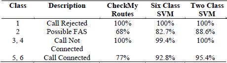 Therefore, in order to compare the accuracy of the proposed classifier, the combination of accuracies for classes 3 and 4 and classes 5 and 6 were computed. From the six class approach, it can be seen that the proposed SVM classifier is superior to that given by CheckMyRoutes. For the two class approach, the overall accuracy of the classifier was computed by the combination of the correct classified calls for Class 2 and the combination of the correct classified calls for Classes 5 and 6. It can be seen that the two class approach increases the overall accuracy of CheckMyRoutes and the six class approach as well.