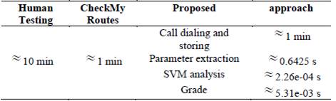 Call grade using the proposed methodology also improves the efficiency of VoIP call testing, in terms of time, by using computational technologies to bypass human analysis. Supposing that 10 calls are sent to the destination carrier, a human takes around 10 minutes to perform this task. However, when using a computational technology that can dial the 10 calls simultaneously and analyze by itself the result of the calls, around two minutes are spent. Table 4 summarizes this comparison. The Parameter Extraction value is the mean of the time spent analyzing each one the 2750 total calls. The SVM analysis value was computed as the average time that an SVM takes to analyze each of the 2750 calls (16 parameters) times 10. Finally, the call grade was determined as the time MATLAB computes a weighted mean. Now supposing that the commercial department of the VoIP carrier needs to test 30 destinations with the constraint of testing 10 calls per destination, using the same math, a technician would need 300 minutes to test for the best scenario (test numbers available, fast dialing, acute hearing, no pause between tests, etc.). However, CheckMyRoutes would take, for the same number of tests, at most four minutes supposing that it only supports testing 100 calls simultaneously. The proposed system would take at most five minutes. This result shows the gain in time when automating the testing.
