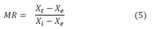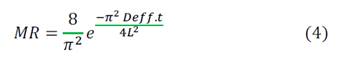 MR represents the moisture ratio, 𝐷𝑒 𝑓𝑓 , is the effective diffusivity of the moisture (m2 s-1), t is the drying time (s) and L is half the thickness of the pumpkin cut into rectangles (m). The coefficient of diffusivity was calculated from the linearized slope in (Eq. 4). The MR value was calculated using (Eq. 5).