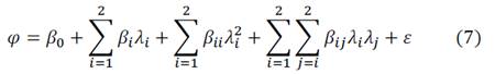 Where φ is the response variable, β0 is a constant number, βi, βii and βij are the linear, quadratic and cross coefficients, respectively. Λi and λj are the levels of the independent variables and the error is represented by ε. The adjustment to the model is interpreted by the correlation between the factors and the responses through the coefficient of determination (R2). The more significant combinations of factors in the model were identified using an ANOVA variance analysis (p≤0.005), using Minitab 17.0 statistical software (Minitab® 17.0, Minitab Inc., PA, USA).
