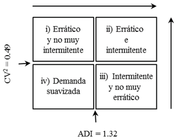 Las series de demanda que presentan períodos con valores cero, consideradas demandas nulas, pueden ser caracterizadas en cuatro tipos según los grados de intermitencia y desempeño errático [2]. Para este fin son calculados dos indicadores: un Coeficiente de Variación Cuadrática (CV2), y el Promedio del Intervalo entre Demandas (ADI). Este último valor puede ser clasificado en otros cuatro grupos: i) errática, cuando el tamaño de la demanda presenta elevada variabilidad; ii) intermitente, cuando la serie presenta varios valores nulos de demanda; iii) granulada ó irregular (en la literatura es conocida como lumpy) cuando la variabilidad del tamaño de la demanda y los períodos entre dos demandas no nulas son altos; y iv) atenuada, cuando la variabilidad del tamaño de la demanda y el período entre dos demandas no nulas son bajas [3-5]. La Fig. 1 muestra esta tipología y los límites de CV2 y ADI.