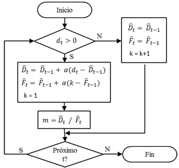 Una de las características particulares del método CRO es el resultado expresado en términos de una tasa prevista de demanda intermitente, y entendida como la razón “demanda/período” [9]. La Fig. 2 presenta el algoritmo del método Croston donde: