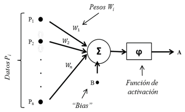 Las RNA son unidades interconectadas de procesamiento de información inspiradas en las neuronas biológicas imitando su estructura, capacidad de procesamiento paralelo y aprendizaje. La neurona es la estructura básica de una RNA. En la Fig. 3 se muestran los elementos básicos de una neurona artificial, a saber:
