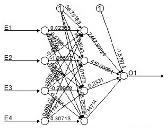 La Fig. 4 muestra una RNA, generada con el software RStudio, con cuatro neuronas en la primera capa, otras cuatro en la capa oculta y una en la capa de salida.