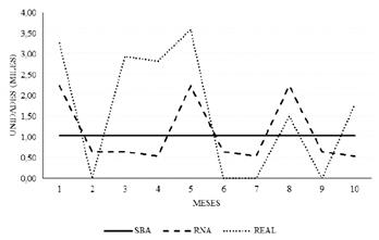 Como se observa, la previsión del método SBA es una razón constante durante los meses proyectados, en cuanto que con la RNA se obtienen valores específicos para cada período.