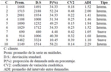La Tabla 1 muestra las particularidades de las series de demanda, los valores ADI, CV2 y la categorización según la regla especificada en la Fig. 1.