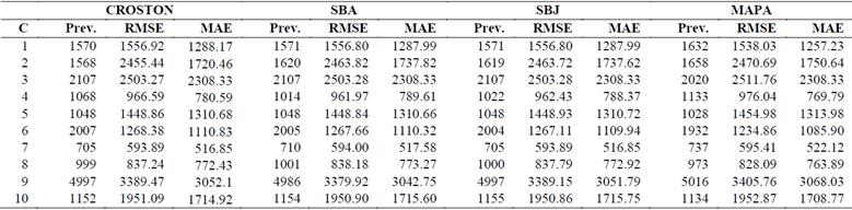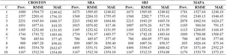 De acuerdo con esta práctica, la Tabla 3 resume los resultados de la previsión de la demanda intermitente fuera de la muestra. En esa tabla se observan las previsiones estimadas con los métodos clásicos: CRO, SBA, SBJ, MAPA, y sus respectivos errores RMSE y MAE. Como son estimaciones de demanda de piezas de reposición, los valores de las previsiones son redondeadas a números enteros.