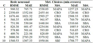 Como se observa en la Tabla 4, en todos los casos analizados, las previsiones con RNA presentaron mejores resultados que los obtenidos con los métodos clásicos, los valores de RMSE y MAE fueron menores en las previsiones con RNA.