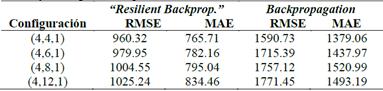 Por otro lado, fueron utilizados modelos basados en RNA de tres capas para estimar la previsión de la demanda intermitente. En todos los casos, las redes fueron entrenadas utilizando los algoritmos “Backpropagation” y “Resilient Backpropagation-RProp” [34]. Fueron testadas varias configuraciones de MLP (4,N,1) modificando, fundamentalmente, el número de neuronas en la capa oculta. Las redes que fueron entrenadas usando el algoritmo RProp presentaron menor RMSE y MAE. La Tabla 5 muestra, por ejemplo, los resultados obtenidos para el primer cliente.