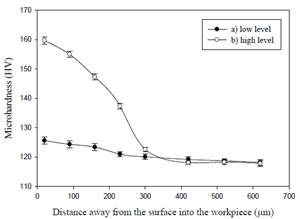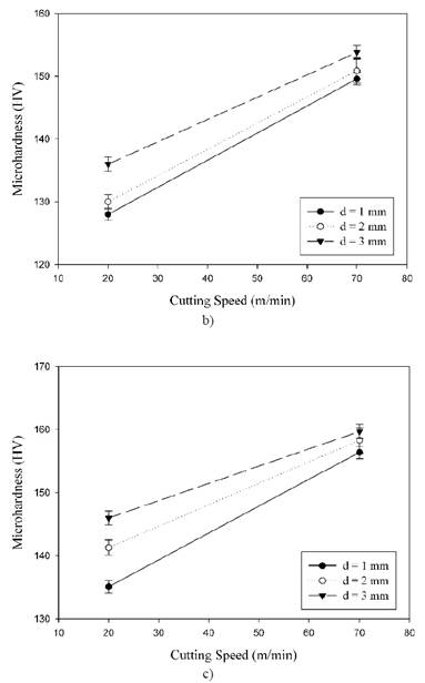 An analysis of Fig. 3 indicates that an increase in depth of cut causes greater average maximum values of hardness. These results are consistent with previous experiments [1,5,9]. This trend suggests that an augmentation in the value of the depth of cut leads to an increase of the cutting forces, resulting in a more severely work-hardened surface layer [16]. A very small increment in the hardness with the depth of cut is indicated by the slopes of the curves, resulting in differences values of 2% and 8%, corresponding to fixed cutting speed and feed rate.