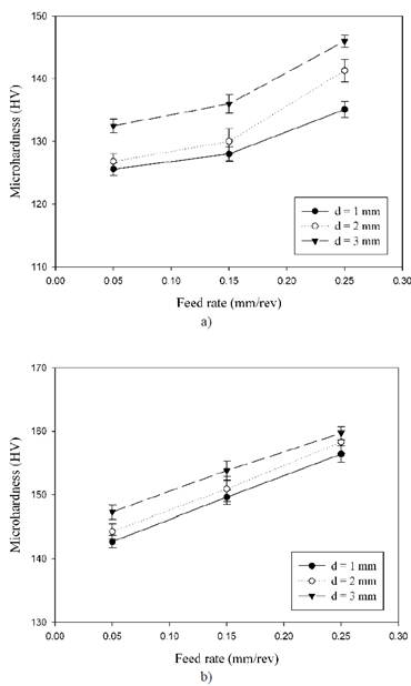 Influence of feed rate on the average maximum values of microhardness is shown in Fig. 2. The maximum hardness was studied since it is more significant and is the value exposed to the higher loading conditions on a component in service.