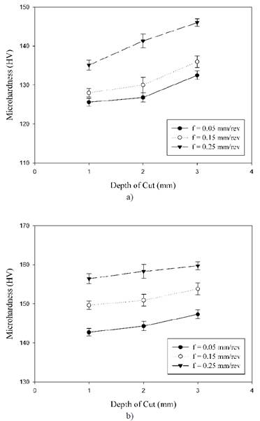 In literature, some efforts have been made to analyze how the depth of cut affects the surface hardness. In most cases, it was found that higher values of hardness are obtained by increasing this cutting parameter on turning of AISI 304 stainless steel [1], AISI 316 stainless steel [5] and nickel based alloy INCONEL 718 [9].