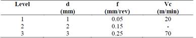 Three factors were considered for evaluation and arranged by using a technique of variables [11], with three levels of feed rate, three levels of depth of cut, and two levels of cutting speed for 18 combinations in total. The limit values shown in Table 1, were restricted by the lathe, and were selected based on previous experience with AISI 1020 steel [12].