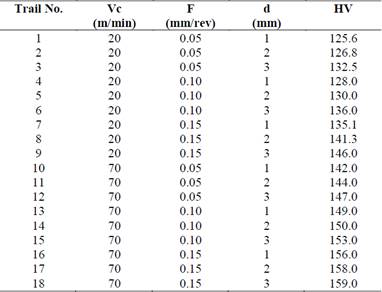 Table 2 shows 18 set of cutting parameters listed as per orthogonal array with corresponding surface average hardness values.
