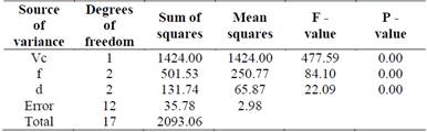 A statistical analysis of experimental data using the analysis of variance (ANOVA) for maximum values of microhardness was calculated and is presented in Table 3. The results obtained show significant (P<0.05) effects for the depth of cut (d), feed rate (f) and cutting speed (Vc) on the hardness values. Additionally, F-test decides whether the parameters are significantly different. A larger F-value shows the greater impact on the machining performance characteristics [18]. Larger F-values are observed for speed as 477.59.