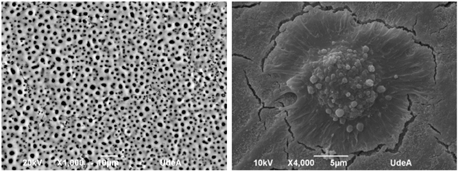 Una excelente opción para el manejo del magnesio en esta aplicación, podría ser la combinación de estas dos opciones -aleación y su posterior tratamiento superficial- para así obtener una mejor opción de implante. En la Fig. 1 se muestran dos imágenes de microscopia electrónica de barrido (SEM) de sustratos de magnesio modificados por la técnica oxidación electrolítica por plasma PEO antes y después de ser expuesto a un ensayo bilógico para evaluación de la superficie.