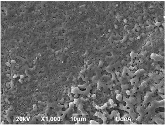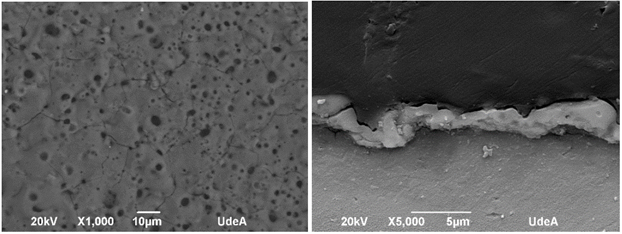 En la Fig. 2 se muestra una micrografía SEM, correspondiente a una investigación sobre recubrimientos obtenidos por el proceso PEO con dicho electrolito, en la que se observa una alta porosidad de la película anódica. En ella se puede notar que los poros formados en general son circulares y de diferentes tamaños, además de obtenerse una capa anódica homogénea. El espesor de la película es aproximadamente 3 μm.