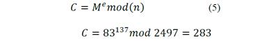 6. Creates a private key with the set (p, q, d) = (11, 227, 33) and a public key (n, e) = (2497, 137). Now, using ASCII code, “s” is represented with 83 as the message to transport to use the cipher and decipher steps.