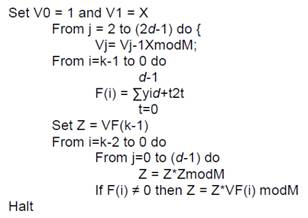 The M-ary algorithm can be subdivided into different sub processes as follows [5]: exponent segmentation in w windows of d bits, preprocessing and storing of every possible power of any base in a range determined by 0 to 2^d, squaring and multiplying to obtain a result. These steps are illustrated in the pseudo code scheme shown in Fig. 1.