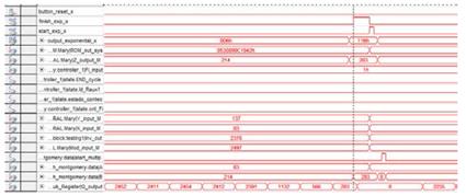 The modular multiplication control system was optimized using a Flip-Flop T to reduce the number of steps in FSM. Additionally, if a zero value segment was detected in the exponent, the central control unit avoided a multiplication.
