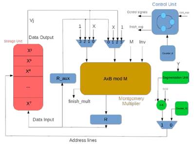 In a block description, modular exponentiation has four subsystems that work together including the Montgomery Multiplier, the Storage Unit, the Exponent Segmentation Unit, and the Control Unit. These blocks are shown in Fig. 4.
