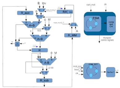 Internally, the Montgomery Multiplier has another sub control unit, which synchronizes a data path and advertises to the central unit when multiplication is finished. This controller also switches sources in the multiplier when a Montgomery cycle is completed, as illustrated in Fig. 5.