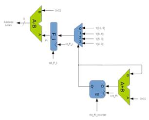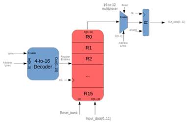 Address lines are used to control a storage unit, which is composed by a set of 16 registers with 12 bits width each, and an input decoder takes the address and enables writing to one register. When reading is required, a 16-to-12 multiplexer connected to the address lines takes the register data and puts it into the output register; these lines send a Vj signal to the Montgomery Multiplier. This system allows writing and reading one register at a time, and the internal structure of the system is shown in Fig. 7.