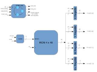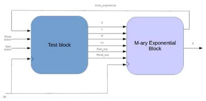 For testing purposes, a test block is added. The test block contains the inputs pattern to the M-ary block. Each block contains a set of 48 bits, which are subdivided in 4 numbers of 12-bit length and represent the needed inputs as follows: a base (X), an exponent (Y), a modulus (M) and a correction factor (R). There are a total of 4 samples, as reflected in the use of a storage system with an attribute of 4 words - 48 bits ROM. This system starts each exponential process and senses a finish flag bit provided by the exponential block. When an exponential process finishes, a counter changes the address pointer that is controlling the ROM behavior and loads the respective data subsets in the output registers. Fig. 8 illustrates the testing structure.
